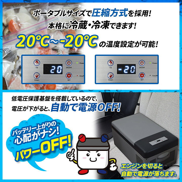 商品名 冷蔵庫 車載用 12/24V対応 商品情報 ● 車の中でも、お部屋の中でも使える2WAY電源! シガーソケットからでも、家庭用電源からでも使用できます。
